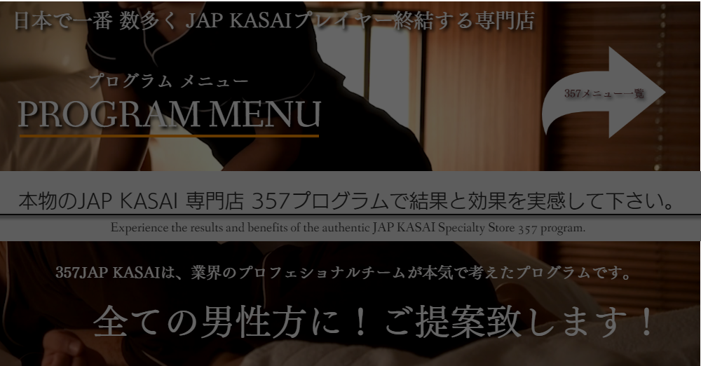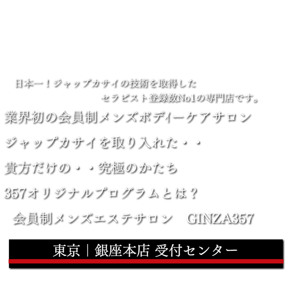 究極男の健康法:357プログラム 357ブランドの魅力は、ジャップカサイ(睾丸マッサージ)取り入れたトータルボディーケアです。お客様に合った、プログラムを考え、身体、お肌、精神面と全ての悩みにアプローチし元気になるホルモン、セロトニンの分泌を高めることが目的です。あらゆる、施術法を取り入れ筋肉や、リンパ、リンパ節、脂肪、毛細血管にアプローチします。( 指・手の平・手根・うで・ヒジ )全てを使って、全身の筋肉疲労の解消や老廃物の排泄、冷え、むくみを解消できるように導きます。また、タイ式の上級レベルの ジャップカサイを日本人男性に合うように、アレンジして取り入れた、オリジナルマッサージは特に、男性にとって生命力の源にもなるホルモン(テストステロン)の活性化にもつながる、健康な身体造りに効果的です。身体も心もなんだか疲れている…。全身の疲労、冷え、むくみ、身体のだるさ、不眠などある方には、短期ではなく、長期的にお客様の健康をトータルサポートして参ります。最低3回以上2週間程を目安に357プログラム施術を受けると、より効果が実感できます。私たちは、医者ではございませんので治療などはできませんが、男性の皆様が活躍できるように全力でお客様にマッチした施術方法を行うことが、私たちのミッションです。 【東京|銀座本店 銀座357とは】 Men's Total Body Care 357JAP KASAI 専門店 他とは違う本物の技術がここに! 業界のスペシャリストチームが本気で考えた日本人の体に合った痛くない睾丸マッサージプログラムで効果と結果を実感下さい。 関東:神田・赤坂・横浜|東海:名古屋|関西:大阪|東北:仙台 Ginza357|509Tokyo| 玉屋Tokyo 札幌|福島|高崎|松本|金沢|甲府|高松|福岡|那覇 Ginza357全国ピックアップエリア 関東エリア受付センター【東京/銀座本店】 0120-916-846 毎週月曜日定休日 年中無休 営業時間11:00~23:00 最終受付21:00 予約の際はご利用エリアをお伝え下さい。